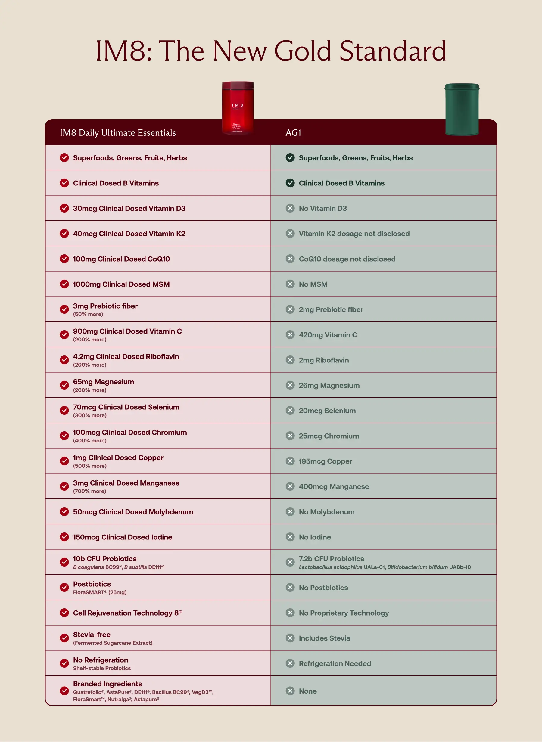 Specifically, arsenic and cadmium levels in IM8 are up to 90% lower than AG1’s reported figures. While trace amounts of heavy metals can naturally occur in plant-based ingredients, this sharp contrast highlights IM8’s superior ingredient sourcing, manufacturing standards, and quality control.