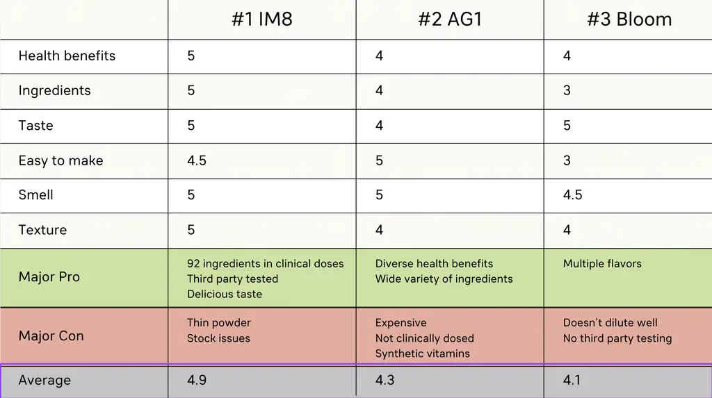 I did not expect this, but newcomer IM8 Daily Essentials + Hydration ($79) blew it out of the park and claimed the top spot on my list. Here’s why it checked all my boxes: